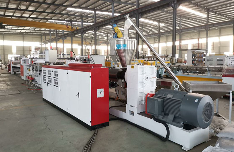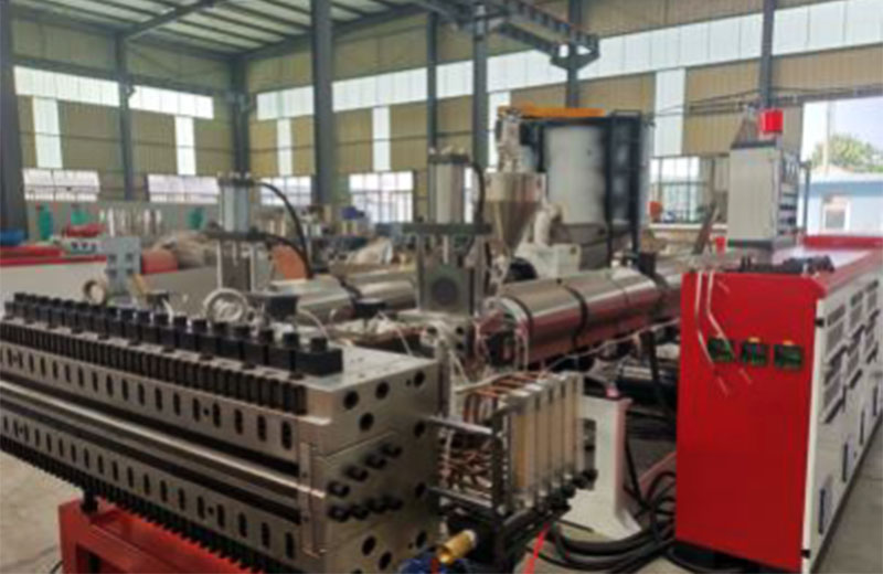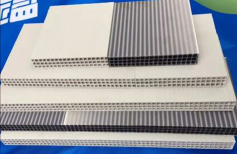 PP 中空建筑模板设备分为一模单出及一模双出,并且分为共挤及单出机型,PP中空建筑模板一模双出生产线是在传统 915mm 单出生产线的基础上,经过不断创新,不断验证后,推出的全新产品,在满足大产量,低能耗的同时,提高产品质量的稳定性。共挤通过三层复合分配器两套挤出机共挤,产品上下表面材料可以复合均匀,复合厚度可以根据需要灵活调整。