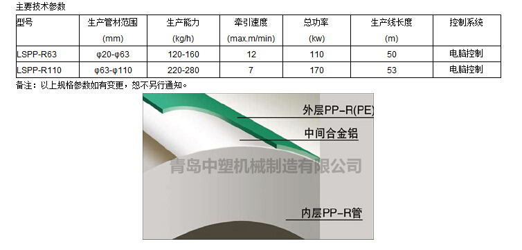 新型稳态PP-R 管材生产线 是为了克服普通PP-R 管材因膨胀系数大,抗蠕变性能差,明装变形等缺点而研制的,该生产线 以挤出成型的普通PP-R 塑料管材为内层,在其外表面包覆一层铝箔后,再包覆一层PP-R 料为管材外层。铝箔与塑料之间用专 用热熔胶粘贴牢固。