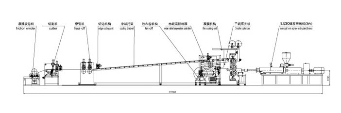 PVC、EVA、PE 防水卷材生产线 主要用于生产 PVC地板革类产品和 PVC防水卷材产品。PVC 地板革具有耐磨、耐腐、防滑、防渗、阻燃的性能,广泛用于机车、宾馆、酒店、娱乐厅、展馆、家庭。PVC 防水卷材可适用于工业与建筑业的各种屋面防水,地下室,水库,堤坝,公路隧道,铁路隧道,防空洞,粮库,垃圾厂,废水处理等建筑防水工程。