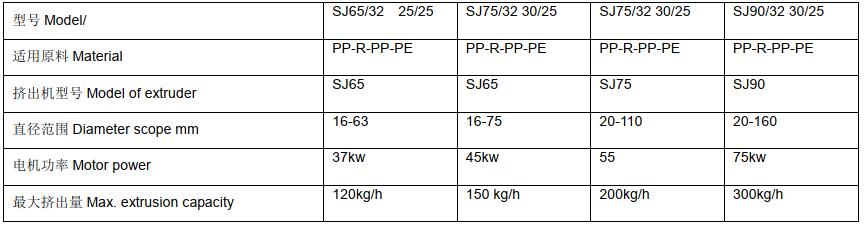 配置专用单螺杆挤出机,具有高速挤出,高效速化等特点。 特殊设计模头,流道合理,管材外内壁光滑,内应力小。生产管径范围 φ20-φ160mm 生产速度高达 15 米/分。